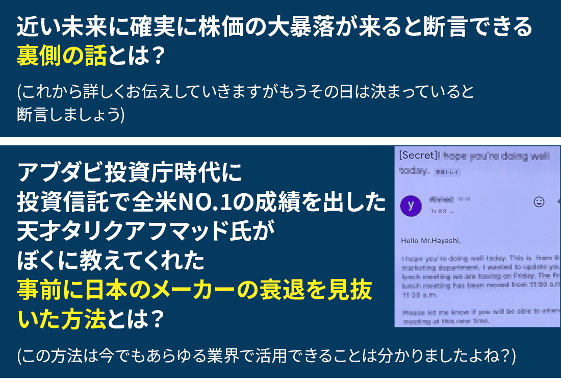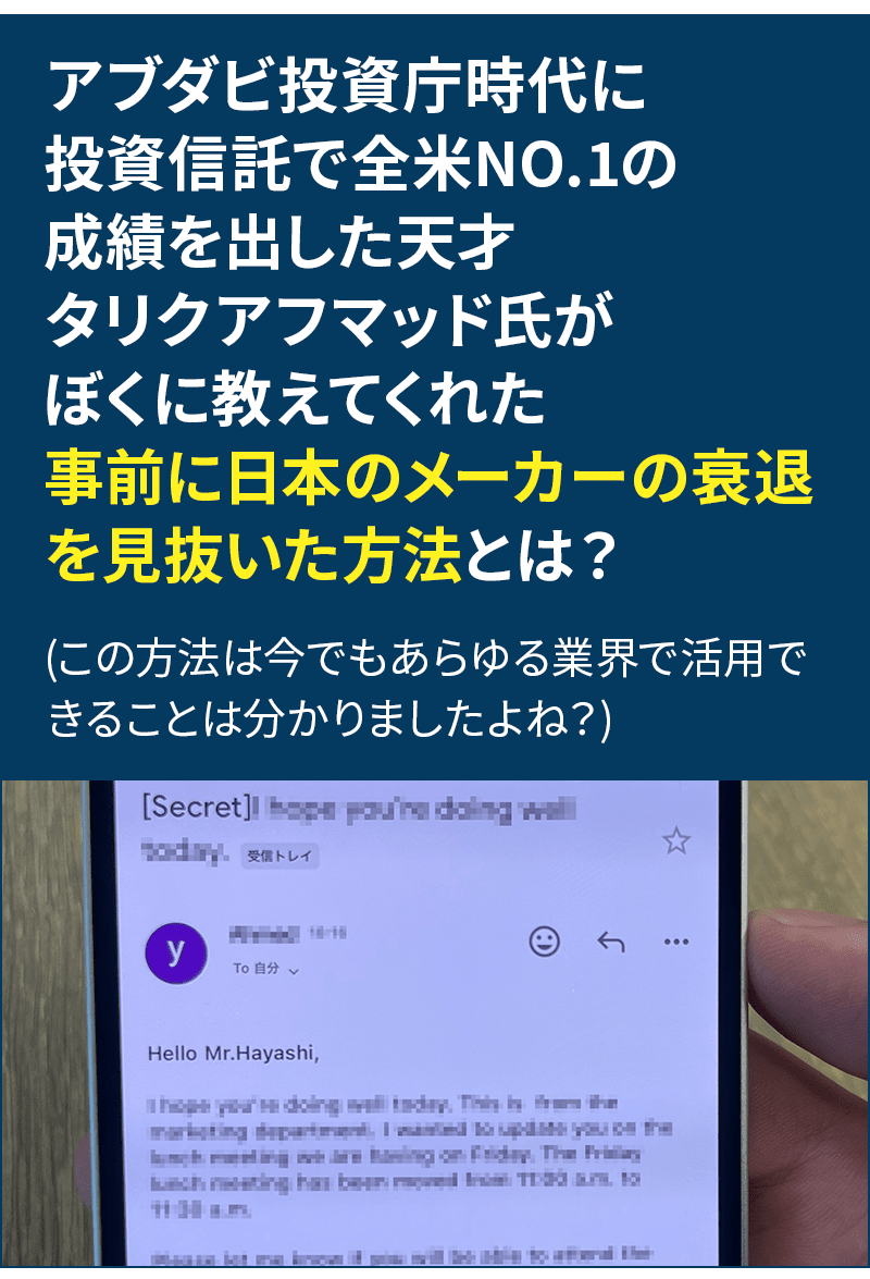 長い間ぼくがファンドマネージャーとして大きな成果を出して駆け上がれたのには理由があります。それは「世界最高峰の投資ノウハウを知った」からです。 この投資ノウハウは「誰でも知るだけで投資で大きな利益を出せる」ものです。 (本当ですよ。今さら私が嘘をつく理由は一切ありませんので) 実際にぼくは、このノウハウを知ったことでバークレイズ信託銀行、JPモルガンチェース銀行でも大きな成果を出し世界最大の政府系ファンドアブダビ投資庁に日本株の総責任者としてヘッドハンティングされて、アブダビ投資庁でもNO1の結果を出しました。 だからこそ断言できるのです。