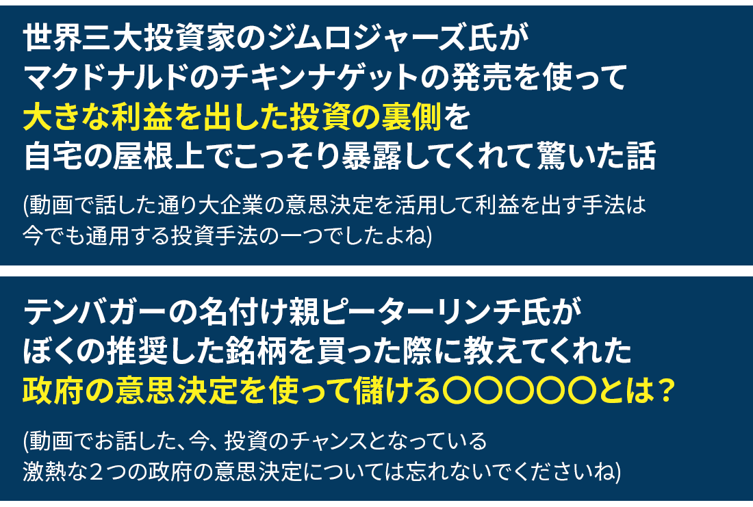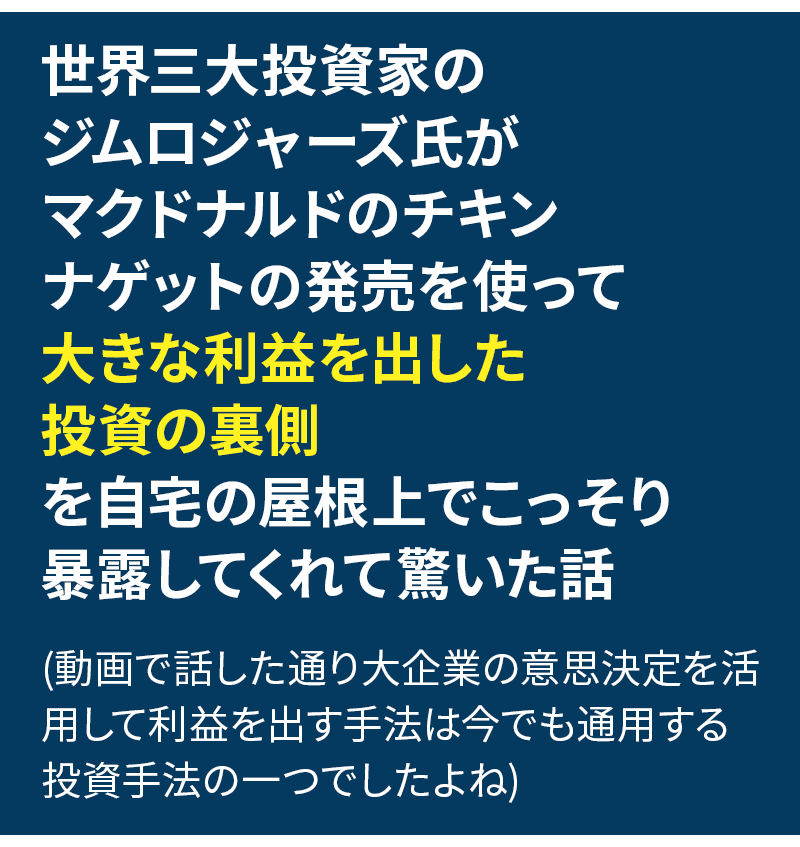 動画で話したジムがマクドナルドのチキンナゲットの発売に乗じて大儲けした実例は今でも通用する手法です。 (動画では、その手法を「今」活用するならばこういう事例があるという即使えて利益に直結する具体例も話してあるのでご自身の投資にお役立てくださいね) 投資にはこういった美味しいポイントがたくさんあるんですよね。 抑えて置けば利益を取れるポイントなので、ぜひ、ご活用ください。 余談ですがジムが日本で有名になったキッカケは 書籍が売れたことなんですね。 (もちろん投資家としての実績がすごいから書籍が売れたわけなんですけどね) 実はジムの日本での初の書籍はぼくが持ち込んだんです。 (日経新聞で有名な日経社から出版しました)
