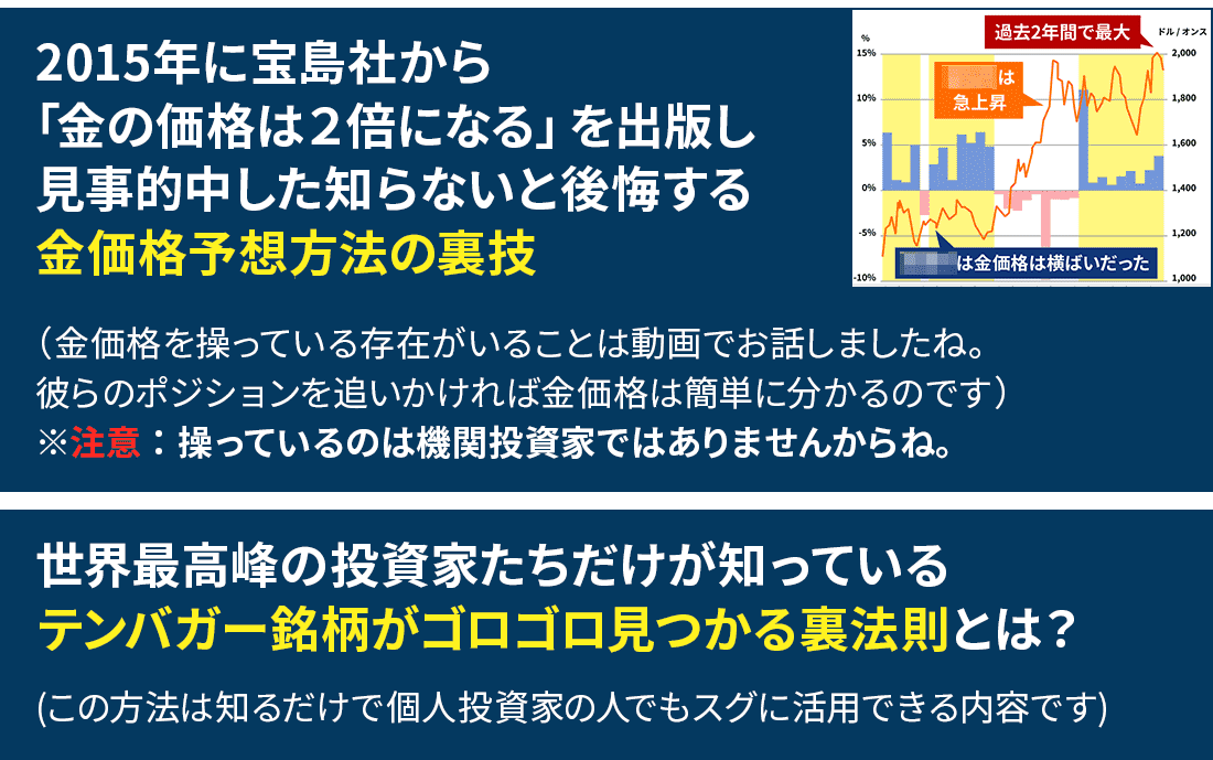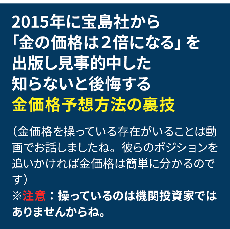 ぼくも書籍で金価格が上がると予想をした責任や証明として 資産の大半を金に変えていましたので資産が膨れ上がりました。 (出版後の講演会で証明として資産の大半を金にします、と宣言をし続けていましたので講演会に来られた人は知ってますよね) この金価格の予想法の種明かしは動画内で行っていますが、 今までの常識がひっくり返ったのではないでしょうか? (金価格を操れる存在がいるという件です。詳細は動画にて) このノウハウさえ知っておけば金価格は簡単に分かります。 利益に直結するお話なのでしっかりと覚えておいてくださいね。