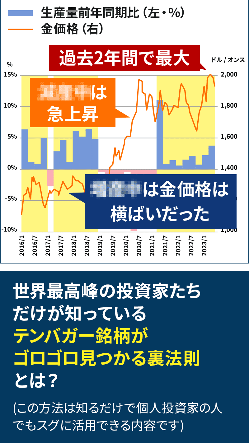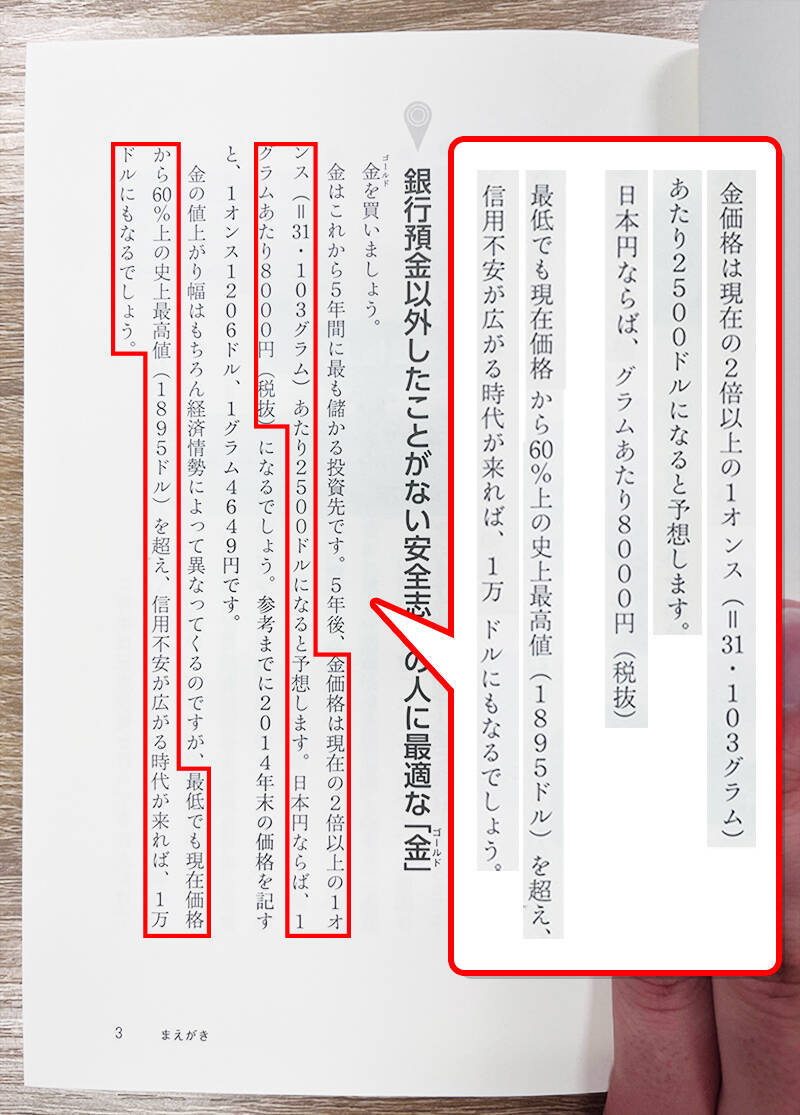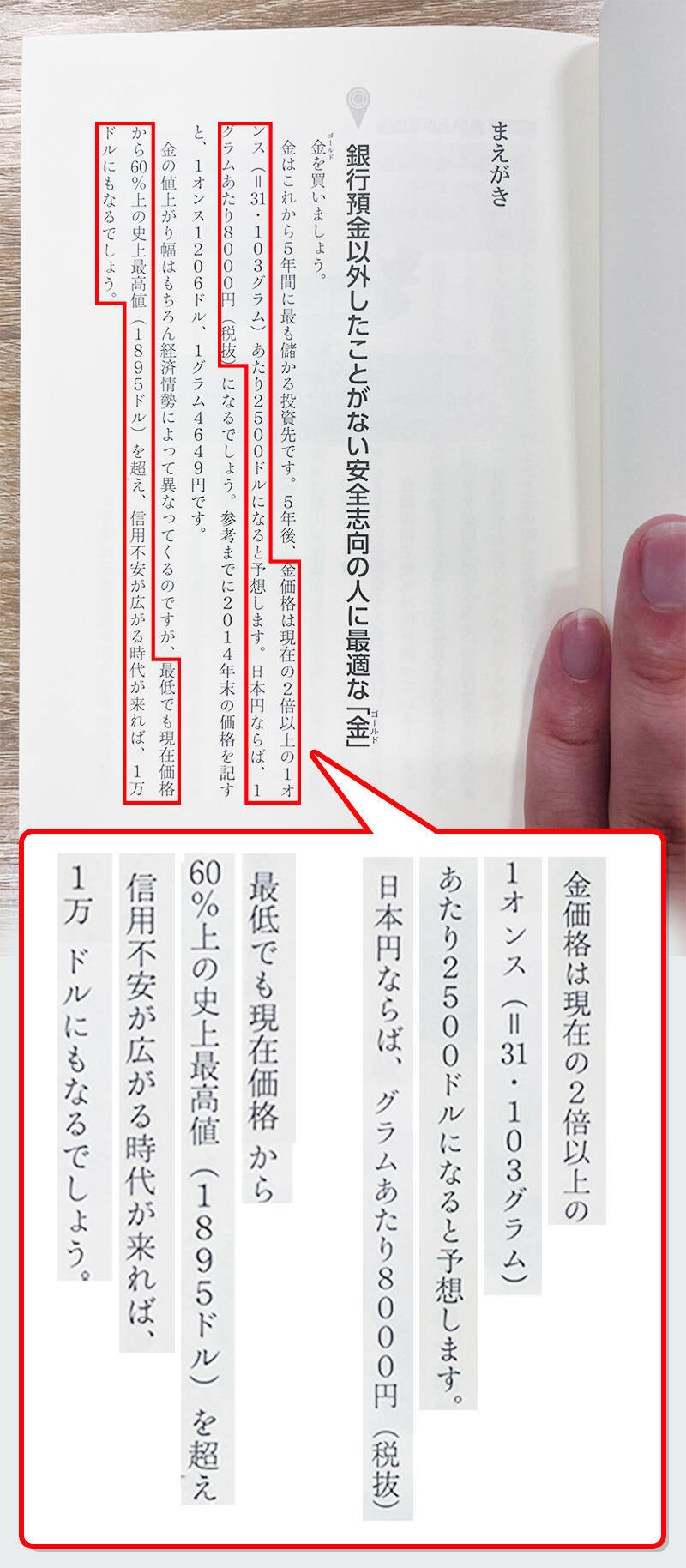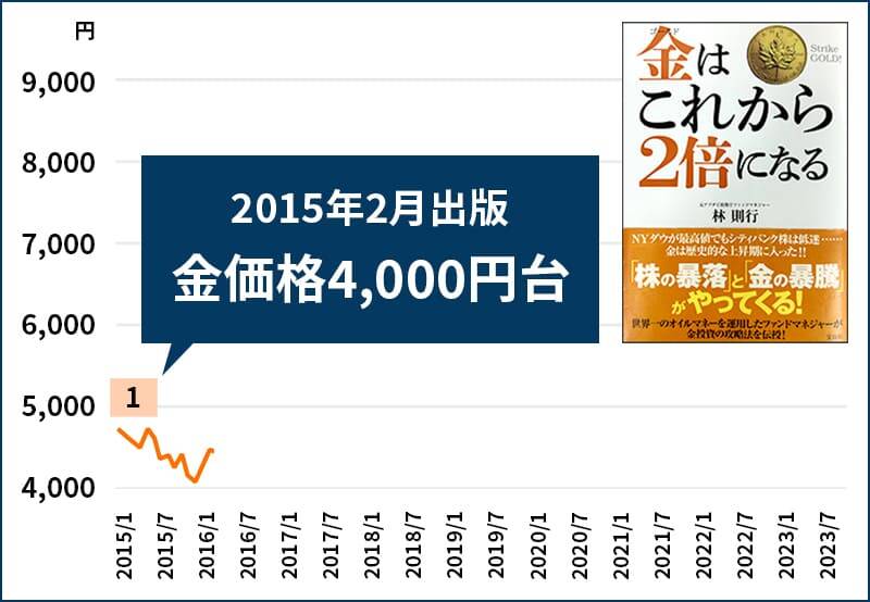 紹介した銘柄のうち およそ8割が数倍以上に値上がり そのうち2銘柄は30倍以上に値上がりしているのです。 (実はこういったゲームチェンジ銘柄(日本ではテンバガー銘柄と呼びますかね)を見つけるのは難しくないのです。そのノウハウもこれから10日間で教えていきますからね) もちろん的中事例は株式だけではありません。 2015年2月に宝島社より「金はこれから2倍になる」を出版。 この時の金価格は4000円台でした。