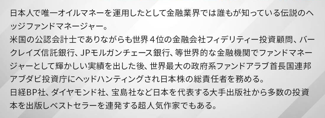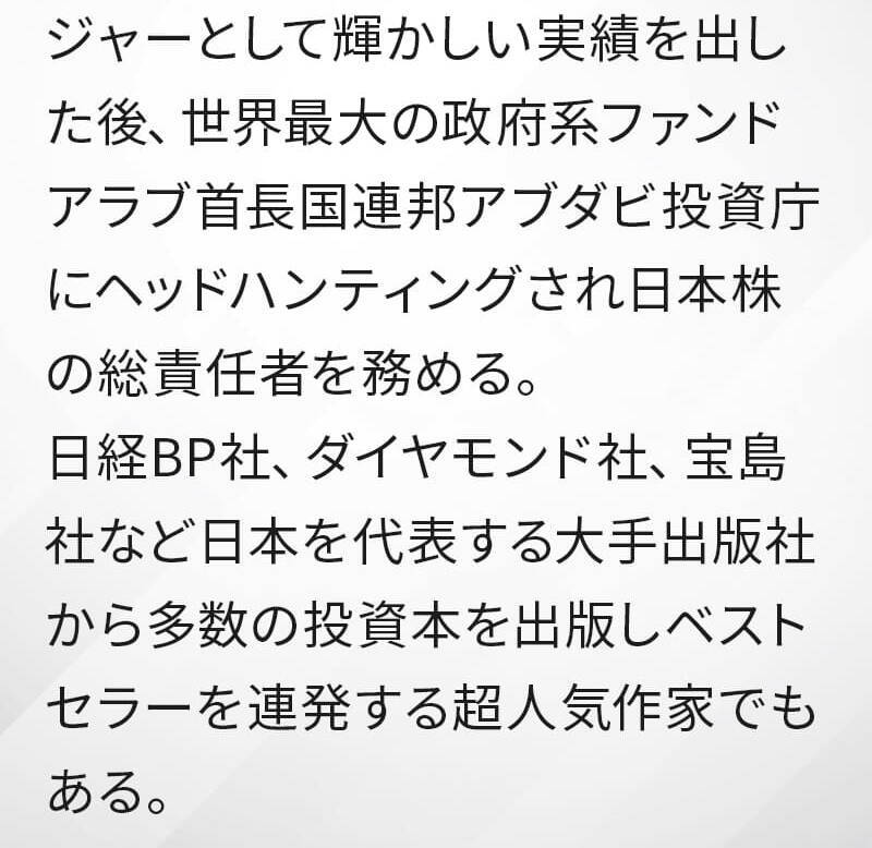 有名人の名前を語る痛い人に思われてしまうかもしれませんよね。 でも、決してそうではありません。 ジムはコロンビア大学で目の前にいるのが日常でしたし ジョエルやピーターも同じオフィスの同じフロアにいるのです。 冒頭で話した通り、世界の金融の中心地のウォール街にいれば 金融業界の有名人が周りにいることは日常なのです。 そして世界最高峰の投資家たちに囲まれながら ぼく自身も共に学び肩を並べて実践してきたことで 世界の金融業界の最前線で大活躍することができました。 最終的に世界最大の政府系ファンドアラブ首長国連邦アブダビ投資庁にて 日本株の総責任者としてファンドマネージャーでも本当に限られた人しか 到達できない桁の運用額を任されるまでなったのです。 動画でインタビュアーの山口さんに「数千億単位ですか?」と聞かれましたが、 そんなレベルではありませんよ。 (はっきりとした額は契約上言えませんけどね) しかも世界のエリートが集まるアブダビ投資庁でNo1の運用成績も出したのです。 ですから金融業界での実績は日本人トップクラスでしょう。 その証拠にはなりませんが 日本を代表する日経BP社、ダイヤモンド社、宝島社などから 「伝説のファンドマネージャー」と呼ばれています。