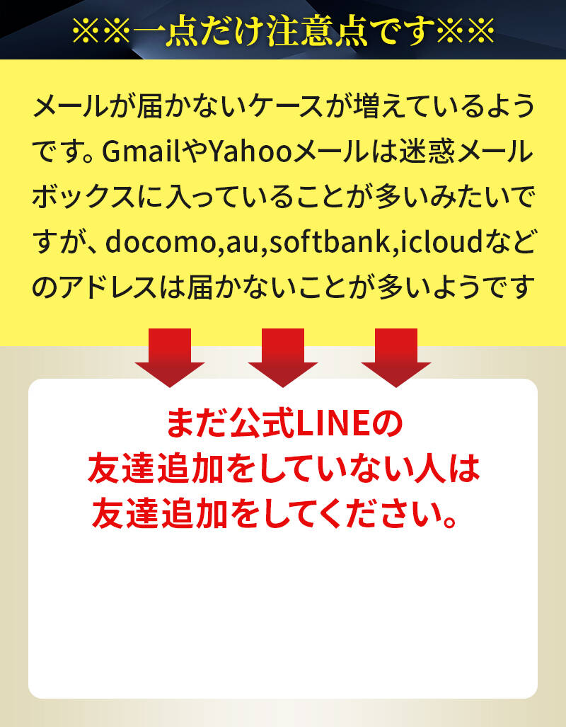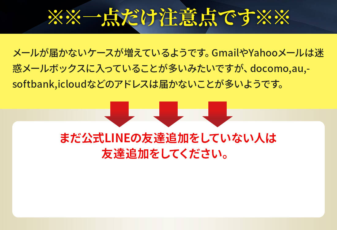 メールが届かない人も多いみたいなので届かない場合には公式LINEから問い合わせをするかメールアドレスに届いていないです、とメールを送ってくださいね。