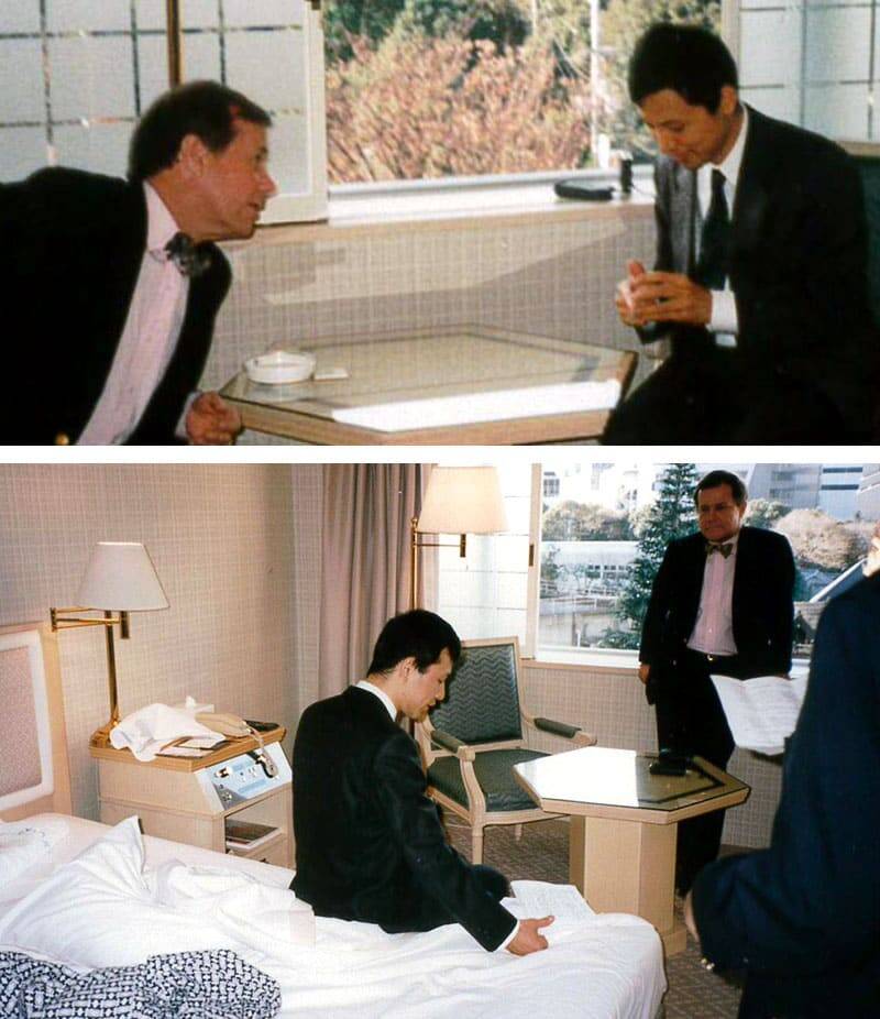 ジムのホテルの部屋でMTGをしている写真です。まさかウェブに出すと思っていなかったのでジムが着ていたパジャマが脱ぎっぱなしです笑。お互いに若いですね。