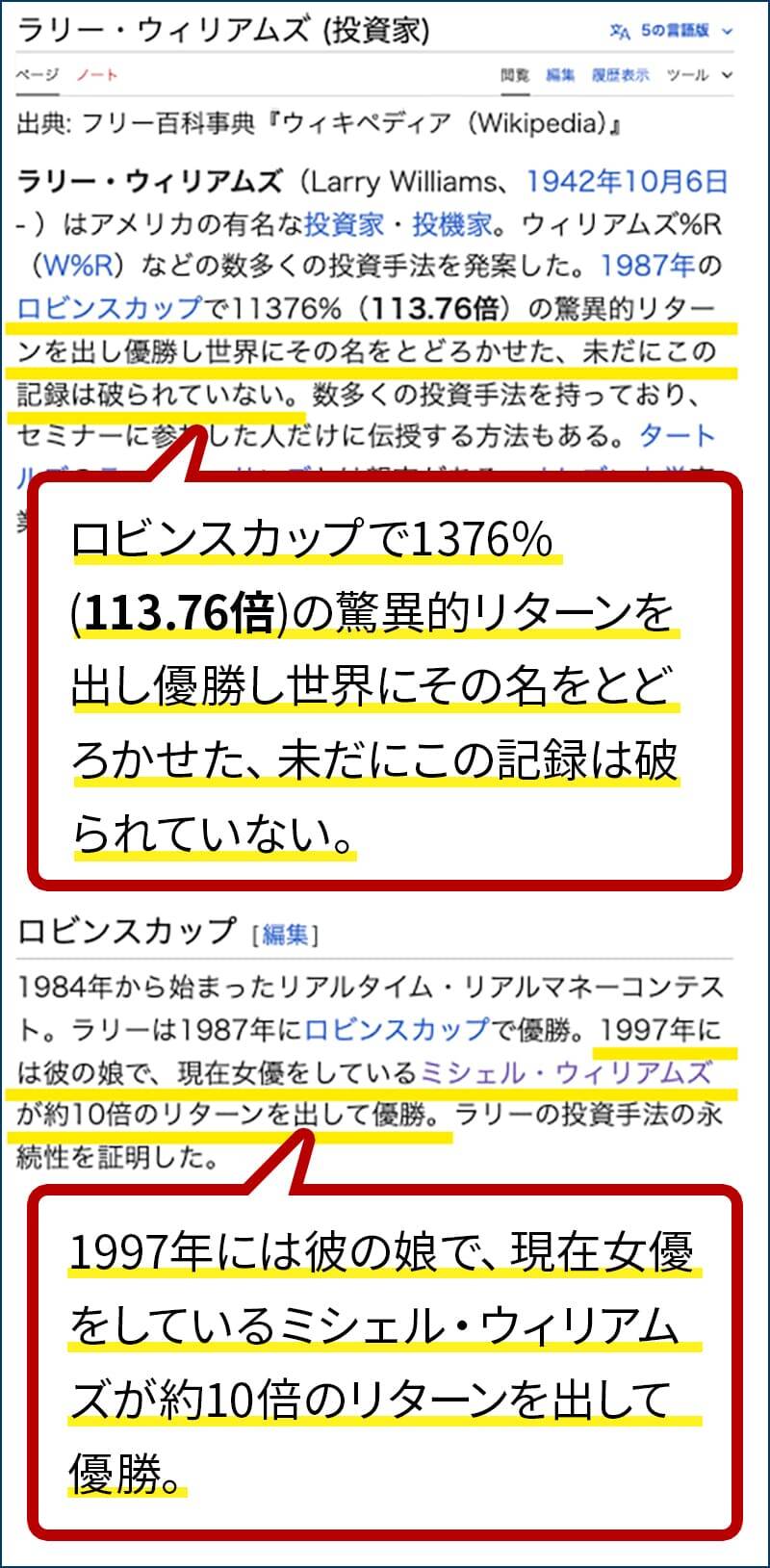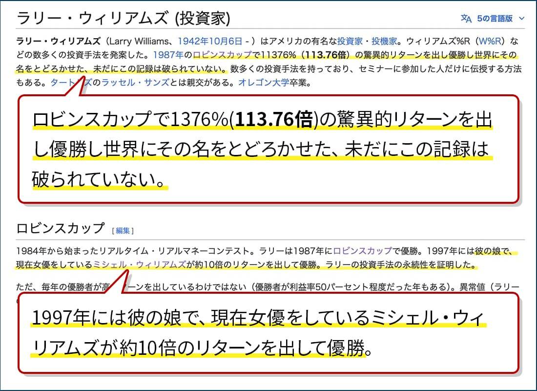 僕も土曜日に自主的に出社していたことで 投資について様々なことを学ぶ機会が得られました。 (オフィスにぼくとジョエルとピーターと変わり者数人ぐらいしか居ませんでしたからね) その一つが動画で話した「規制の変更」ですね。 (今でも通用するのは動画を見てもらったなら分かりますよね?動画で話した空き家や働き方改革の話は上がる銘柄に直結する情報ですよ) ジムロジャーズ氏だけではなくピーターリンチ氏のノウハウも、ぼくの投資ノウハウを格段にレベルアップさせてくれました。 (ぼくもジョエルも成功してることが証明ですよね。これから教える世界的投資家のノウハウは本当に桁外れなのです) ですが、僕が出会い深い関係になり投資ノウハウを学んだり 共に創り上げたりした世界最高峰の投資家は彼らだけではありません。 ぼくは長い間、世界の最前線でファンドマネージャーとして活躍してきましたから 同じようにトップクラスの金融業界のスペシャルな人たちに囲まれていました。 その中でも飛び抜けて天才的な投資ノウハウを持っていた投資家が ロビンスカップで歴代No1のレコードを持っているラリーウィリアムズ氏です。