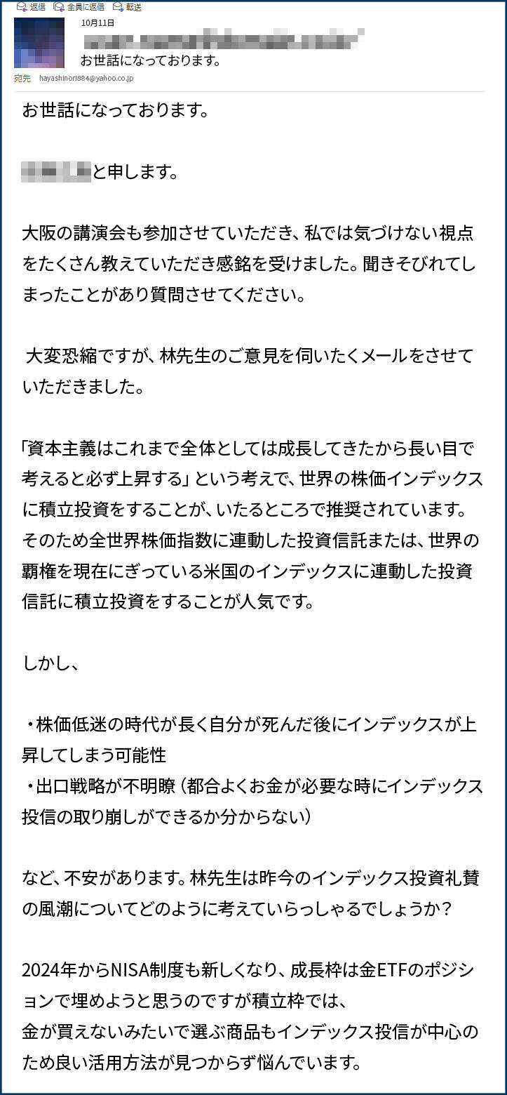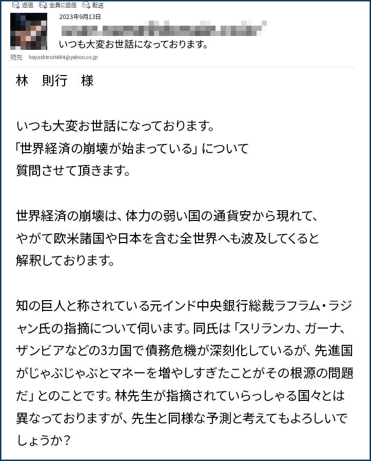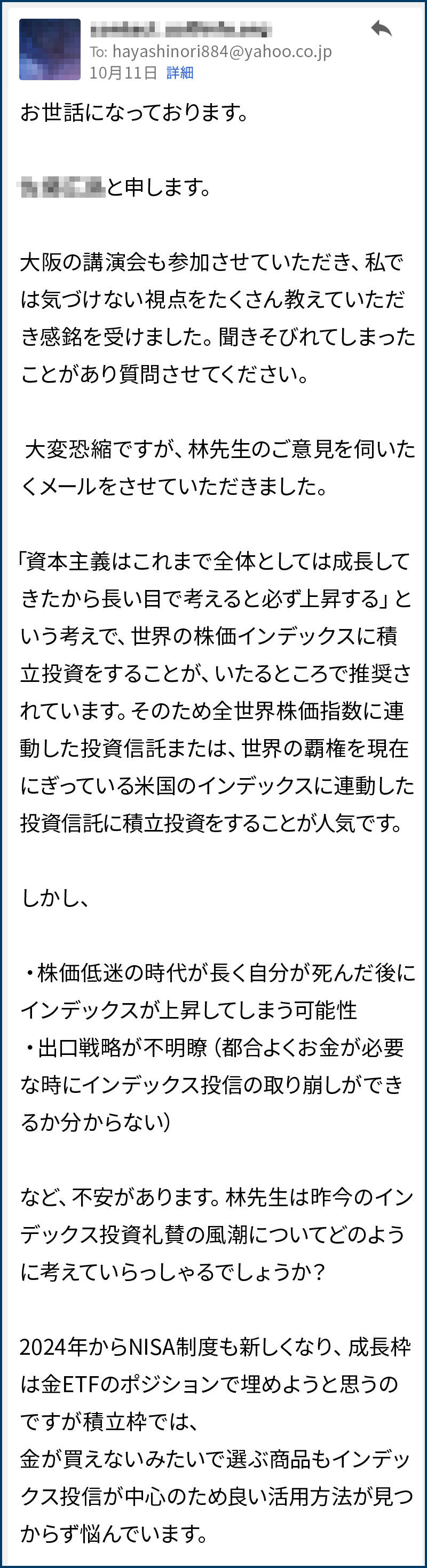 それでも彼らも引退していきます。 (割と若い年齢で引退するのです) トップのファンドマネージャーたちが引退する理由は 「もうこれ以上はいい」という理由が大半です これは理解してもらうのは難しいと思うのですが、 普通の個人投資家の方々は勝てなくて悩みますよね。 我々は「いつまで勝ち続けるのか」で悩むのです。 もちろん大きく勝つ年ばかりではありません。 小さい勝ちで終わる年もありますよ。 (運用額が大きいので小さいと言っても金額は膨大ですけどね) でも、想像できると思いますが、ファンドマネージャーを 何十年も続けると個人の資産も相当貯まるわけですね。 ぼくなんか、アブダビに6年居て引退してるわけですが、 給与も成績ボーナスも高いうえに無税ですからね。 人によっては病気になって引退する人もいますし、 (大きな病気じゃなくても腰痛がひどいからもう嫌だ...とかね) 家族との時間を大切にしたいと想って引退する人もいます。 ぼくの場合は「やり切ったし満足した」んですよね。 不思議なものですが自分のことで満足できると 他人を心から想うことができるようになるんです。 だから決してきれいごとではないのですが、 「多くの人のお役に立てたら」と思って 出版もしてきたのです。 本当にお金儲けで出版してるわけじゃないんですよ (だったら投資をした方がいいわけですからね) 今回のウェブ動画も同じ理由です。 動画でも伝えましたが、これからは激動の時代です。 コロナによるパンデミックを乗り切るために 各国はマネーの総量を大幅に増やしました。 そしてその結果、 株価は割高になり実体経済と連動せず 一部のお金持ちだけが豊かに過ごせて普通の人の生活は苦しくなる一方です。 日本もそうでしょう? バブル以来の最高値と騒がれていますが、 バブルの頃のような豊かさがありますか? だから株価が割高だと言えるのです。 (もっとたくさん数値的根拠があるのですが) なのでこれからは上がり切ったあとに大暴落が来ますよ。 暴落は始まったらあっという間です。 書籍を出す時は1年以上掛けて執筆しているので 大暴落のような急に来るタイミングには間に合いません。 だから、ぼくは初めてウェブ動画に出演することを決めたのです。 この大暴落の準備ができていない人は含み益は一瞬で消し飛び 大損することになりますし、反対に大暴落の準備ができていた人は 莫大な利益を得ることができるからです。 100年に1度のチャンス と言ってもおおげさではないでしょう。 これは知らせなければ大変なことになると使命感もありますし、 お知らせすることで多くの投資家のチャンスにもなると思っているのです。 ぜひね、10日間しっかりとついてきて頂いて 目の前に来ている大チャンスを掴んでもらいたいので。 もちろんそれだけではないんです。 ぼくって子どもが居ないんですよね。 動画でも話しましたが、ジムからは 「ノリ、子どもを作るな、そんな時間があったら相場にあてろ」 と言われてましたからね。 でも決してジムに言われたからそうしたわけではなくて ファンドマネージャーとして激動の日々を送っていたので 子どもを作りたいという気持ちにならなかったのが本音です。 でも、この年齢になると色々と考えるようになるんです。 例えば、投資は好きだけれども、これ以上稼いで何になるんだ?とか、 自分が築いてきたものを遺していきたいとかね。 だって妻以外身内がいないんだから財産を継承する相手もいないわけです。 じゃあ、何かに使うか?というと、投資ばっかりやってきたわけです。 いわゆる相場オタクですよ。今さらハイブランド品を身につけたいか?と 考えると一切要らない。 家だって広い豪邸がいいか?って掃除も大変ですよ。 この年になるとリビングと寝る部屋があったら充分ですよね。 だからぼくはファンドマネージャー引退後に少しでもお役に立てればと 思って本の出版や講演会をするようになったのです。