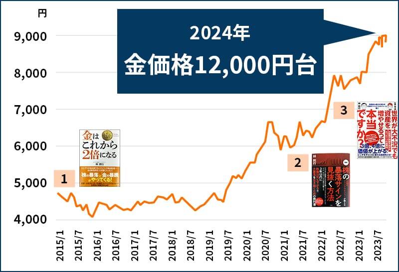 紹介した銘柄のうち およそ8割が数倍以上に値上がり そのうち2銘柄は30倍以上に値上がりしているのです。 (実はこういったゲームチェンジ銘柄(日本ではテンバガー銘柄と呼びますかね)を見つけるのは難しくないのです。そのノウハウもこれから10日間で教えていきますからね) もちろん的中事例は株式だけではありません。 2015年2月に宝島社より「金はこれから2倍になる」を出版。 この時の金価格は4000円台でした。