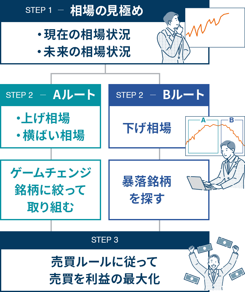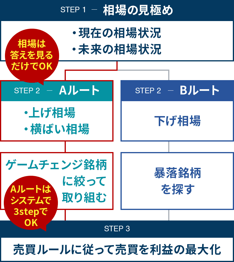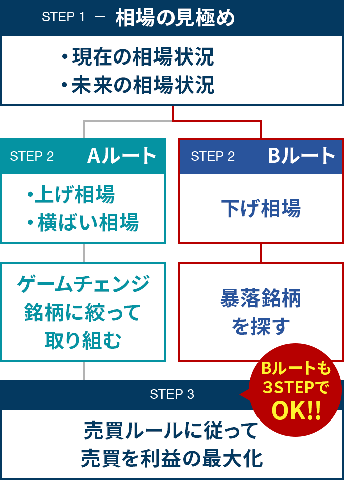 そして相場は問題ないとしましょう。 そこからは上げ相場でも下げ相場でもシステム化仕組み化された3stepで 簡単に投資対象となる銘柄を見つけることが可能です。 上げ相場の場合