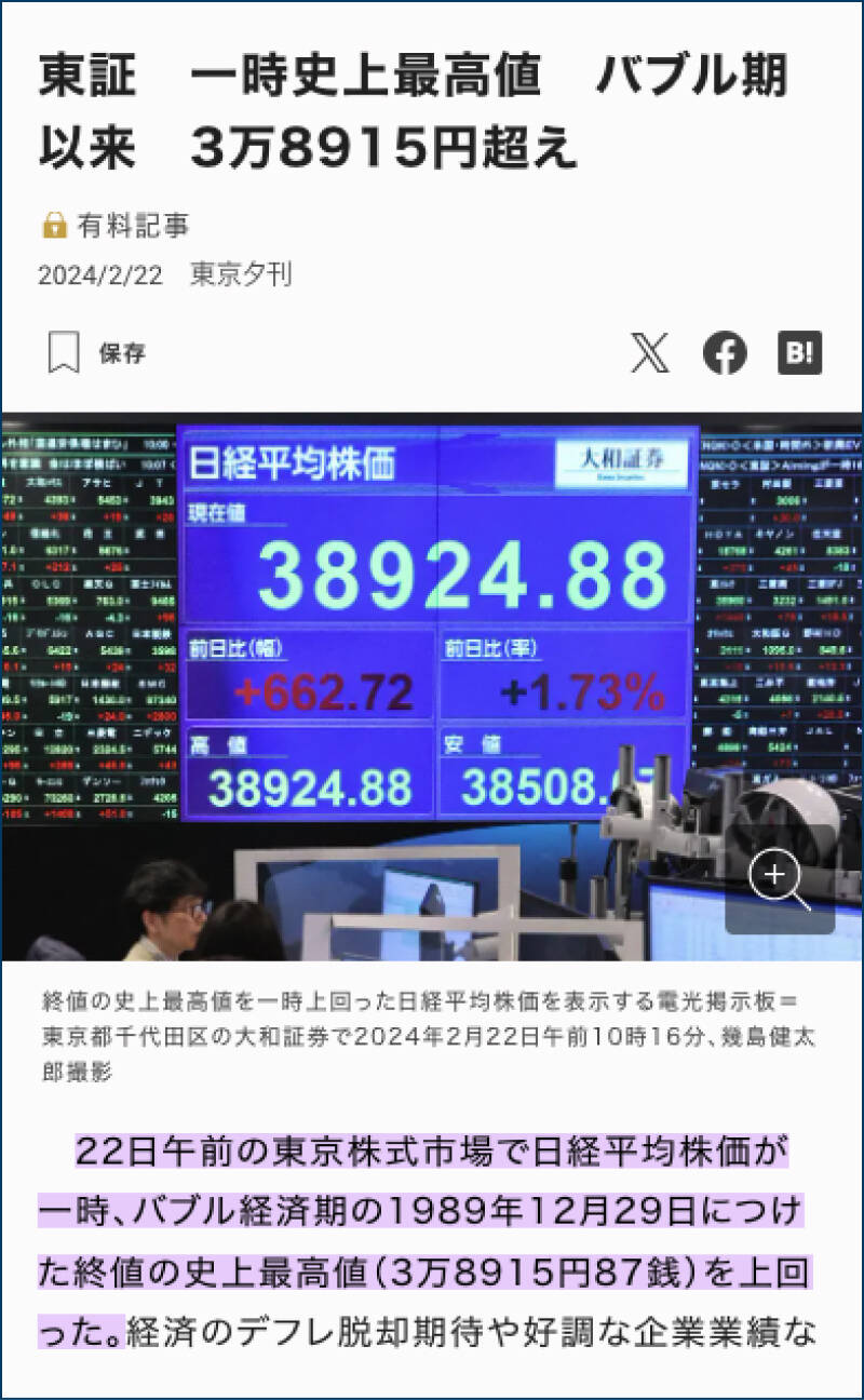 たくさんのお金が刷られればお金が余るので株、不動産、自動車などが 多く買われるので価格が上昇するということですよね。 だから2024年は株高の状態となっているのです。 では、ここで問題です。