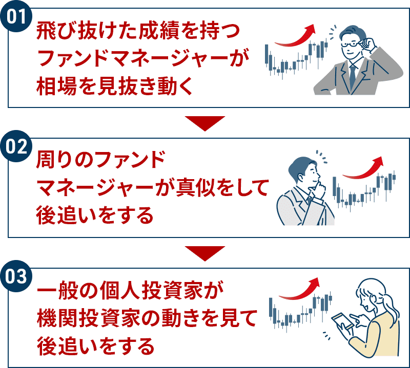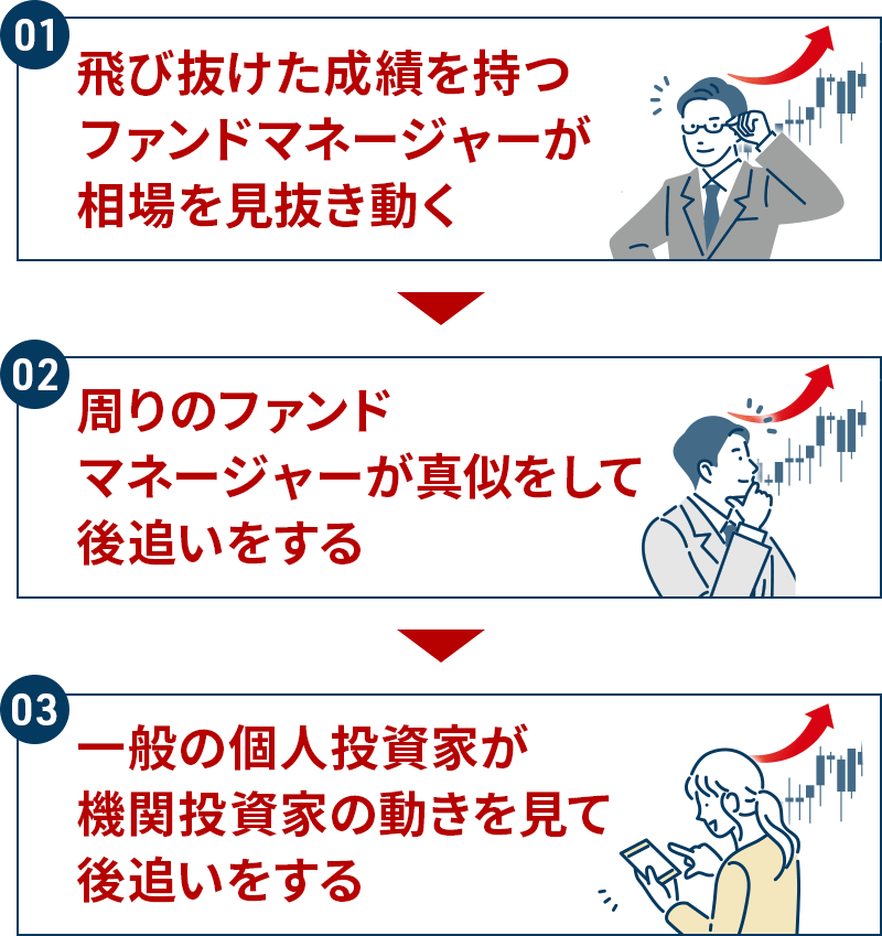 このように運用額の大きいファンドマネージャーが動けば世界中の投資家が追随するのが金融業界なのです。 適切なタイミングで②~③の人が動いた逆を突き 相場は上がったり下がったり創られていくのです。 もっと分かりやすい例を出しましょうか。 例えば長期投資を主体としているウォーレンバフェットが商社の株を持ちました。