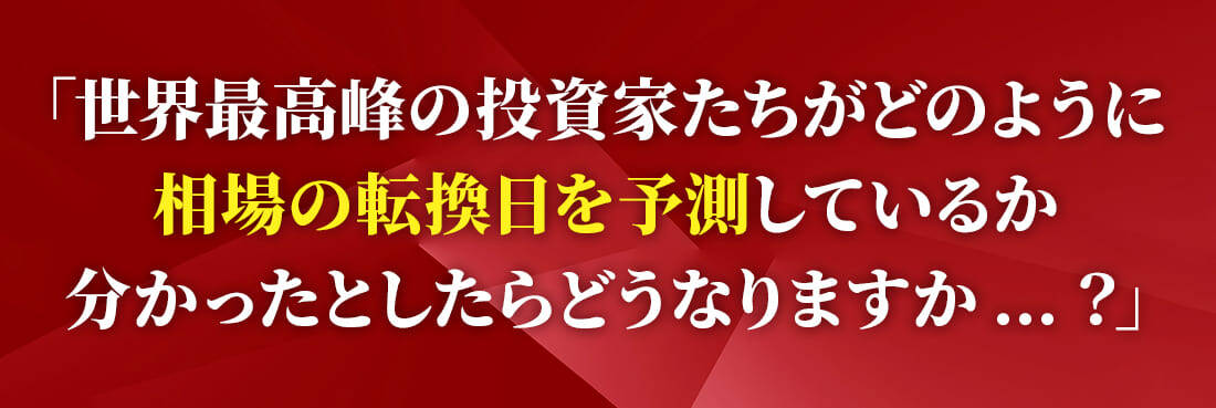 だけでOKなのです。 言い換えれば、 相場の転換日=転換日とされ相場が創られるポイントです。 これは鶏が先か卵が先かといった話で相場が転換する理由は 景気によるものなのか、最高峰の投資家たちが創り上げるのか そのタイミングが合致するわけなのでどちらとも言えるのです。 ですが、確かなことは 「相場の転換日が分かる」 少なくとも 「世界最高峰の投資家たちが転換日とする日が分かる」 ことは確かなのです。