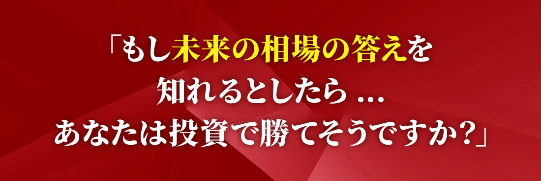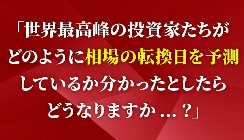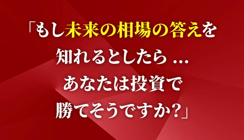 と思ってませんか? 半分正解で半分はハズレです。 実はこの未来の相場の裏情報は あなたも手にしているんです。 ですが個人投資家の99.9%は、その情報を活用できていません。だからこそ世界最高峰の投資家は勝ち続けることができるのです。 つまり彼らは未来の相場を知るノウハウを保有しているだけなのです。 なぜ、そんな事を断言できるのでしょうか? と不思議に思いませんか? 理由は簡単です。分かりやすく簡単にイメージだけを説明をすると、