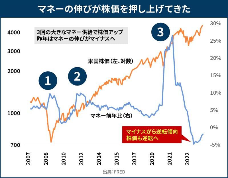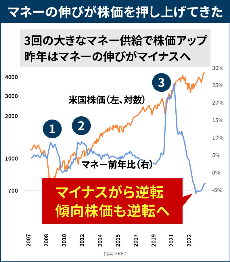 上記の金持ち指標と庶民指標の10項目を見れば分かるのです。 (ぼく独自の金持ち指標と庶民指標の分類した米国経済分析ノウハウについては動画で詳しく解説していますからお分かりですよね?) ここでも簡単に一部だけおさらいしておくと、 例えば、2020年からの株高はコロナによるパンデミック時に マネーの総量を劇的に増やしたことからスタートしています。