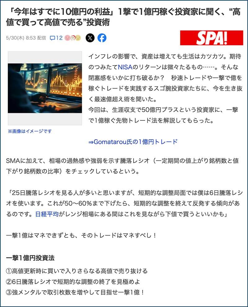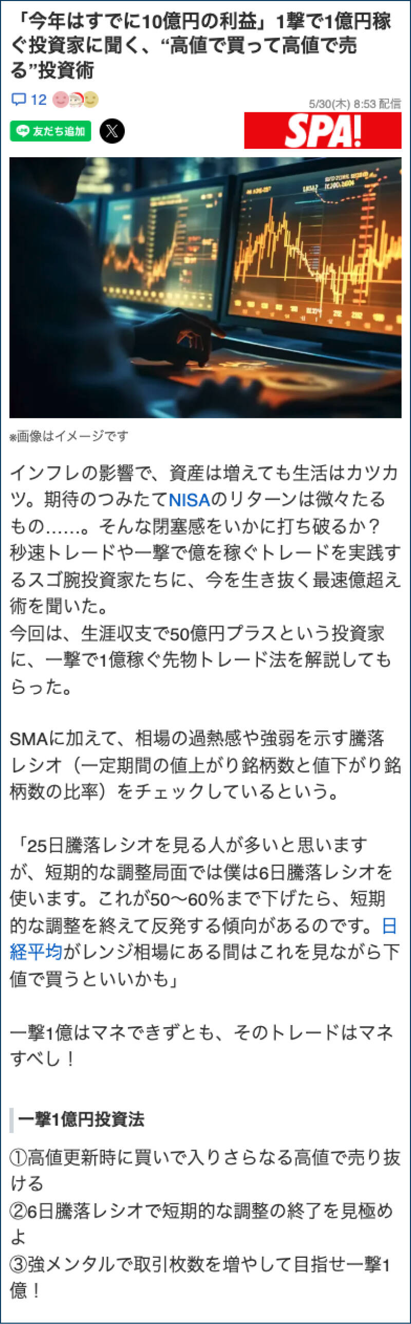 をやるだけでザクザク見つかるのです。 「林先生、それ本当ですか?」 と驚かれているかもしれません。 ちょうどYahooニュースを見ていたら、ぼくが先行指標としてあげている6つの中のひとつ、騰落レシオを見ながら、新高値で買って巨額の利益を出している投資家のニュースが出ていました。