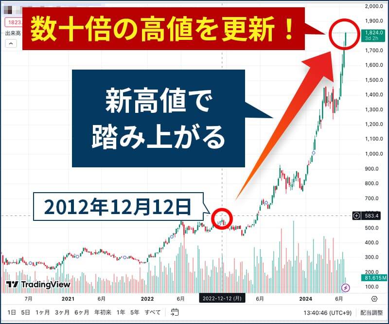 大きな成果を上げている人の考え方は似通ってくるものですね。 世界最高峰の投資家も同様に皆近しい投資の考え方、理論を持っていました。 新高値も勝つ人は誰もが知るポイントなのです。 なぜなら数倍、数十倍にもなる銘柄は必ず新高値を更新します。 この新高値を更新するタイミングで踏みあがる銘柄は 数倍~数十倍の高値をつけていくのです。