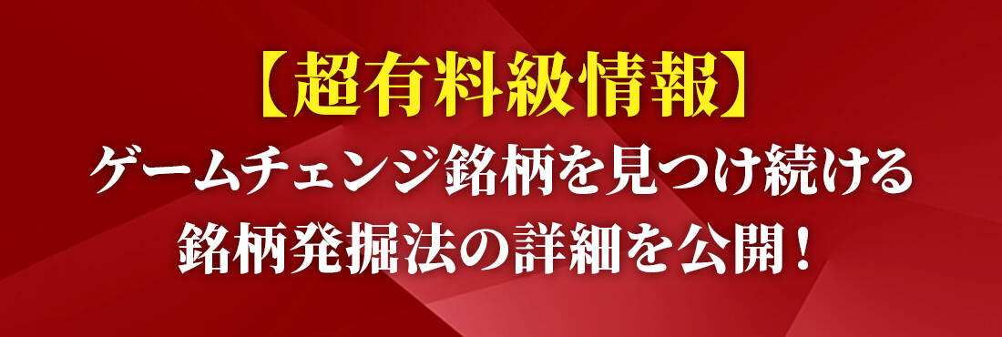 では、ここからは超優良級のゲームチェンジ銘柄の発掘法になります。 (ここでは概要を説明しますが、必ず動画を見て理解度を深めてくださいね。じゃないと絶対に失敗しますので) ゲームチェンジ銘柄の発掘法は