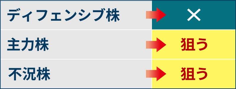 ディフェンシブ株を避けることが大切です。 狙うのは大きく上がり過ぎた主力株と不況株の2種類です。