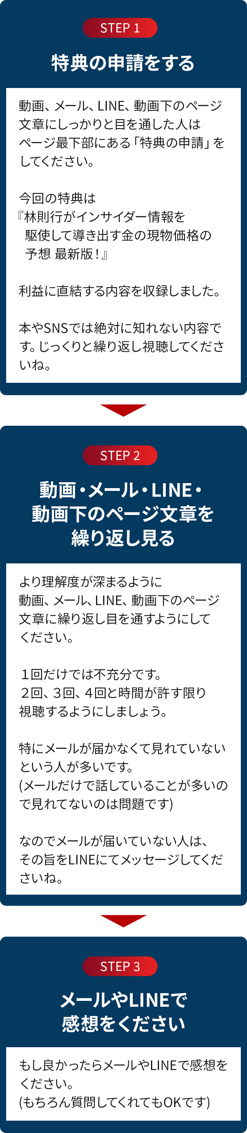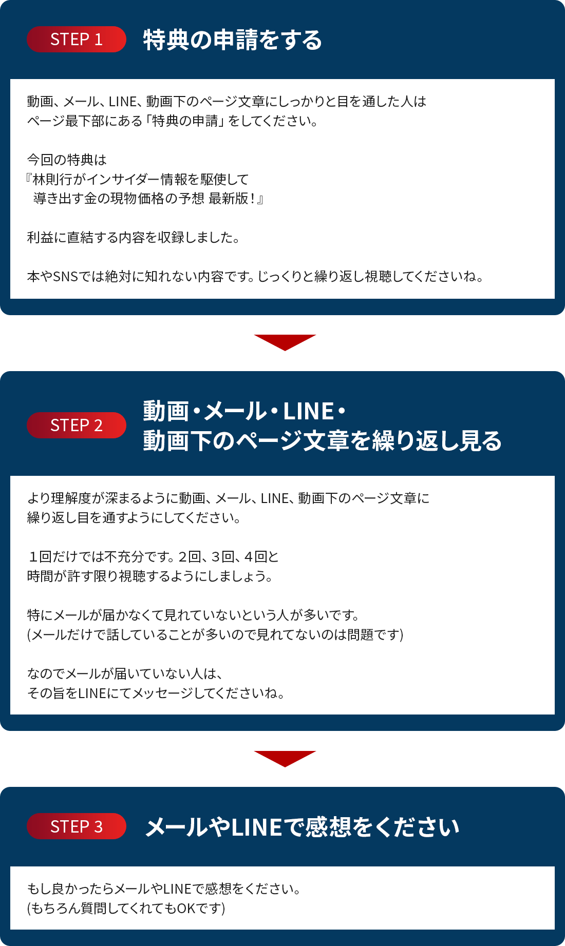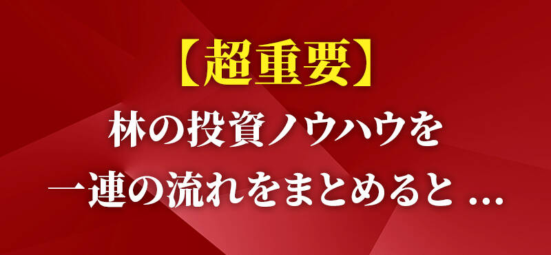 ここまでしっかりと読んでくれてありがとうございます。 動画、動画下のページ文章、メール、LINEに繰り返し目を通してもらえたら あなたの投資家としてのレベルは何段階もアップすることになります。 もしかしたら動画や文章が長く感じたり難しく感じているかもしれませんね。 でもそれも最初だけです。 たったの10日間だけ信じてついてきてくれれば あなたを成功へと導ける自信があるのです。 ぜひ第2話の動画をもう一度じっくりと視聴してください。