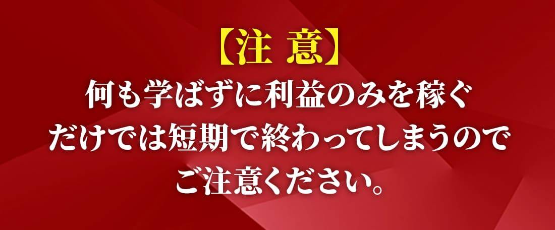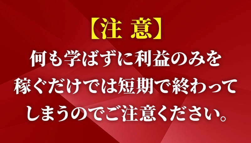 たったのこれだけの手順でOKであれば、 あなたにも簡単にできそうじゃありませんか? そして最後は売買の黄金法則、絶対的なルールを守ることです。 ここはしっかりと分かりやすくお教えしていきますし 一度知ってしまえばスグにできるようになりますからね。 ですが、注意点があります。 あまりにも簡単すぎるからと言って...