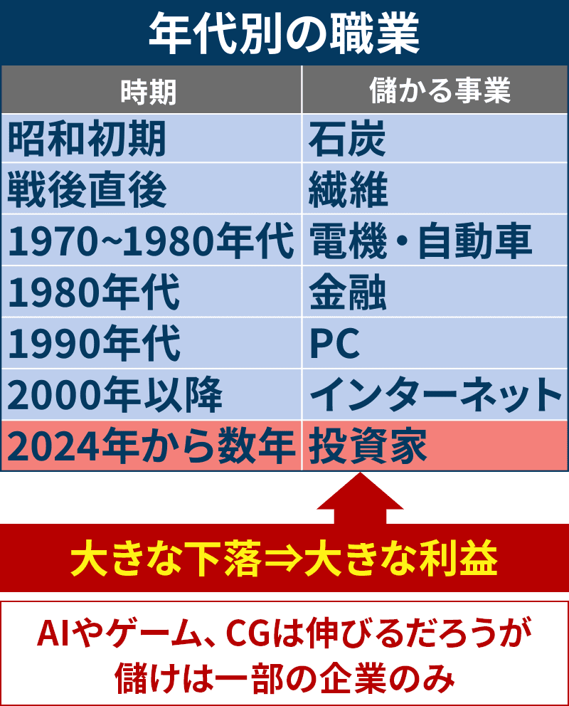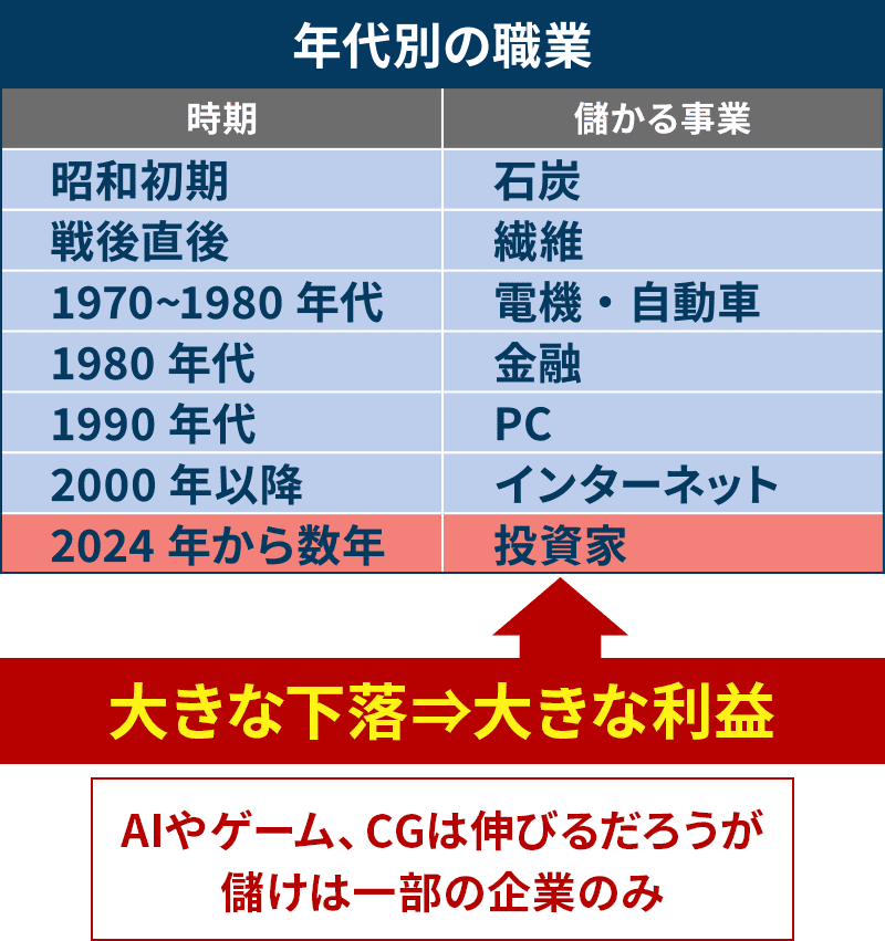 今日、株式投資の基本戦略はお教えしましたよね。 それに加えて金投資とタイミングタイミングで発生するスポット投資を 組み合わせていくのが最良の投資法です。 本当はラリーの理論を用いた先物の機械式売買法もやると 尚資産が劇的に増えていくのですが初心者向けではないので 今回は省くことにしました。 先物がなくても恐ろしいスピードで資産を増やすことは可能です。 なぜなら暴落と暴落後の高騰という数十年から100年に一度の 大チャンスが目の前に来ているからです。 ぼくは2024年以降は「投資家の時代」だと考えています。