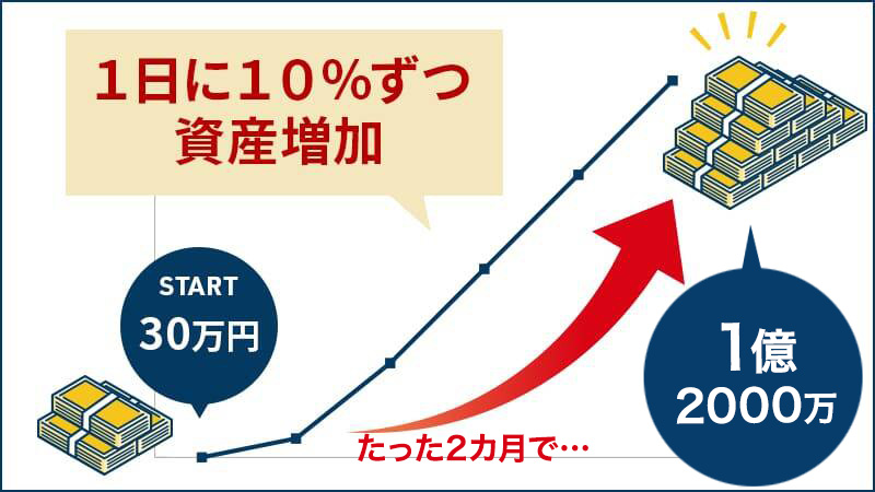 仮に最初の資金が30万円しかなかったとします。 その30万円が1日に10%資産が増えたとしましょう。
