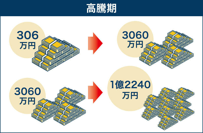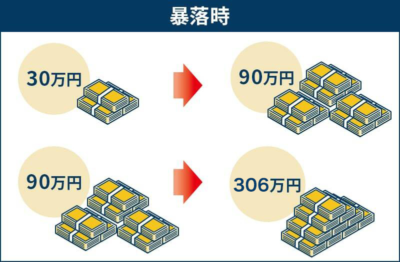 たったの2ヶ月で30万円は1億2000万円になるのです。 これはあくまで机上の空論ですが、最初の資金が少なくても 投資でぐるぐる回していくと複利の効果で恐ろしいスピードで 利益が増大することはお分かり頂けたでしょう。 もし30万円でも、 暴落時に3分の1になる銘柄と5分の1になる銘柄を2つ見つけました。
